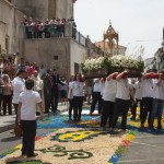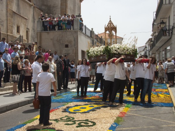 San Vicente de Alcantara Corpus Christi (600 x 450)La Hermandad Infantil de la Entrada Triunfal de Jesús en Jerusalén, Jesús Resucitado y Santísimo Sacramento de San Vicente de Alcántara saca su tercer Titular y el más importante a la calle, el Paso de Jesús Sacramentado. Los vecinos de la localidad salen en la tarde del sábado para plasmar sus dibujos en el asfalto de la calle, que después son rellenos con serrín de colores formando unas bellas alfombras con motivos religiosos y flores. Por estas alfombras pasa la procesión del Santísimo. Es el mayor orgullo para los sanvicenteños dar gracias al señor con estos dibujos que tantas horas, días e incluso meses se llevan preparando para que el Señor los pise. A su paso por las calles, va acompañado de los Estandartes de las distintas Cofradías, Hermandades y Asociaciones de la Parroquia y niños de primera comunión, realiza siete paradas en su recorrido en siete altares decorados para la ocasión donde se reza una oración, esta fiesta está declarada de Interés Turístico Regional.