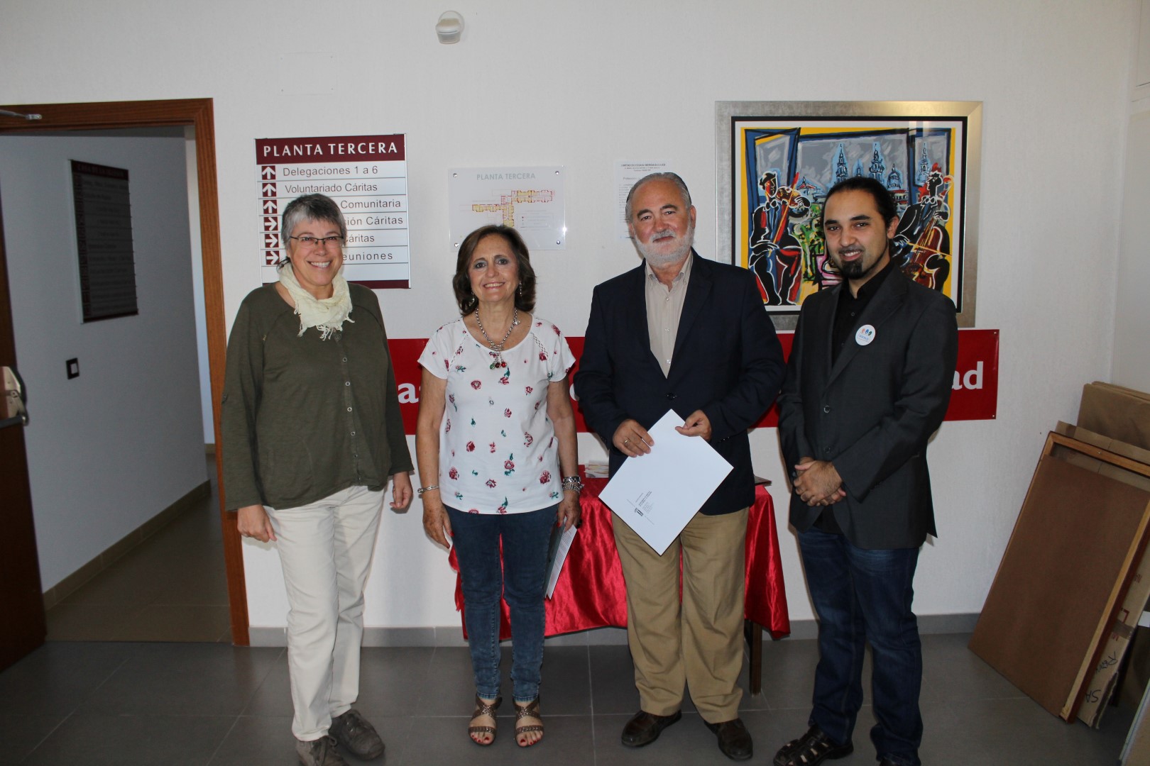 El pasado 12 de junio, Juan Santiago Garrido Moreno, director en funciones de Cáritas Diocesana de Mérida-Badajoz, Moisés García Chamorro, director del coro Vocalis, y Pilar Llorente, tesorera del mismo, se dieron cita en la sede de los Servicios Diocesanos de Cáritas para hacer entrega de la recaudación del concierto.