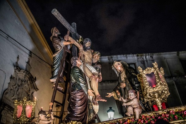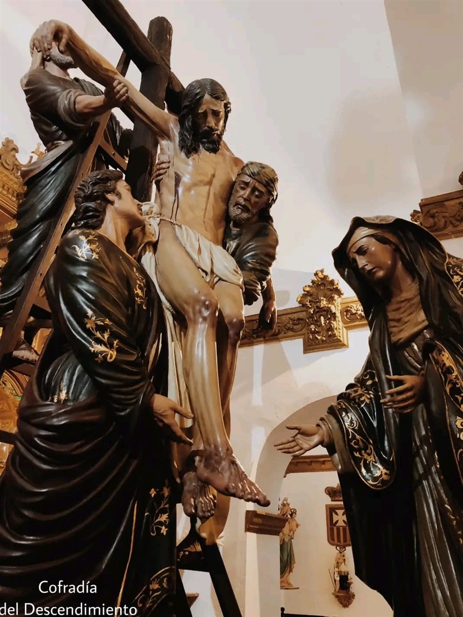 Realizado en el año 1944, el Descendimiento está compuesto por las imágenes en talla completa de Jesús, los Santos Varones, san Juan Evangelista y una Dolorosa titulada María Santísima de la Piedad. El Discípulo Amado, José de Arimatea y Nicodemo -subido en una escalera- descienden el cuerpo destrozado del Maestro, mientras María, desolada, se dispone a recogerlo en su regazo.