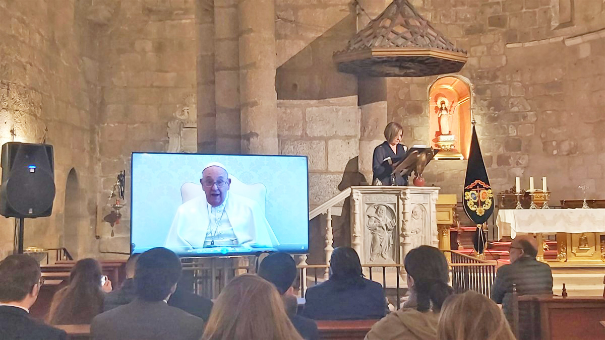 Intervención del papa Francisco en el pregón de la Semana Santa de Mérida pronunciado por Eva Fernández, a la derecha. Foto: Raúl Flores.