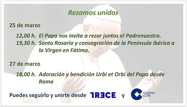 Desde la Conferencia Episcopal se recuerda también la convocatoria que ha hecho el Papa para unirnos en oración el próximo viernes a las 18.00 h., que será retransmitida por 13TV, y este miércoles a las 12:00 h. con la oración del Padrenuestro.