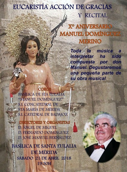 La Eucaristía estará presidida por el Arzobispo y se armonizará con sus obras, terminando con un recital breve (6 obras polifónicas, inéditas), interpretadas por los coros de Santa Eulalia, de la Concatedral de Mérida y de la Catedral de Badajoz, en total unas 75 voces.
