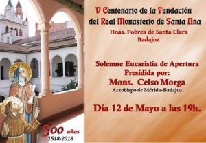 Han pasado 500 años desde la construcción del monasterio de Santa Ana y, lo que es más importante, de la presencia de la fraternidad de Hermanas Clarisas reunidas en torno a Jesucristo pobre y crucificado a lo largo de cinco siglos en Badajoz. Su presencia, oculta por la forma de vida, no pierde nada de su fuerza y veracidad, sino que su valor y servicio, radican en ser existencias que expresan la dedicación exclusiva al Señor en la alabanza y su donación en el maternal cuidado orante que se extiende a los habitantes de la ciudad, de la diócesis y del mundo entero.
