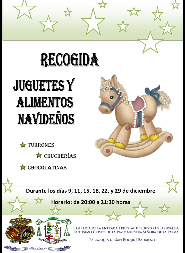 Se acerca la Navidad y la celebración para los cristianos del Nacimiento de Jesús. Dentro de esos días celebramos también la Adoración de los Reyes al Niño Jesus. Es por ello que desde esta Cofradía inician una campaña de recogida de dulces típicos navideños (turrones, polvorones, chocolatinas…) y juguetes, para intentar que todos los niños del barrio de San Roque, en Badajoz, puedan sentir la ilusión en el Día de Reyes.