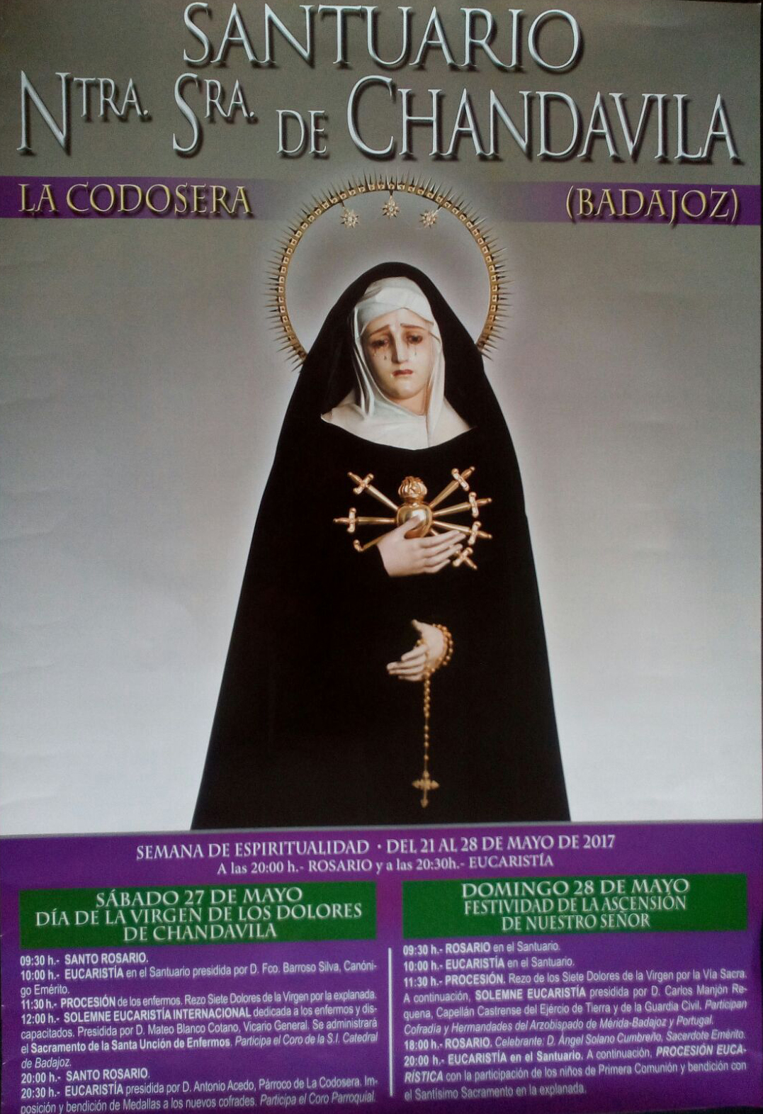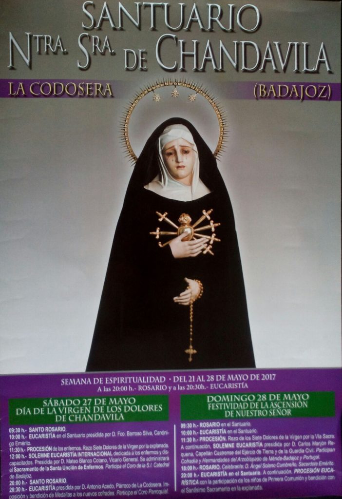 Del 21 al 28 de mayo se celebra en el Santuario de Chandavila, en La Codosera, la Semana de Espiritualidad. Durante toda la semana habrá rezo del Santo Rosario a las 20,00 h., seguido de la Eucaristía, presidida por un sacerdote diferente cada día.