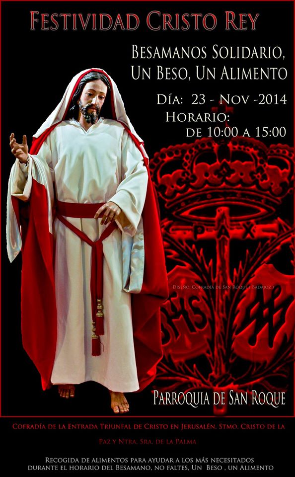 cristo reyCon motivo de la Festividad de Cristo Rey, la Cofradía de la Entrada Triunfal de Cristo en Jerusalén, Santísimo Cristo de la Paz y Ntra. Sra. de la Palma organiza un Besamanos Solidario con recogida de alimentos.