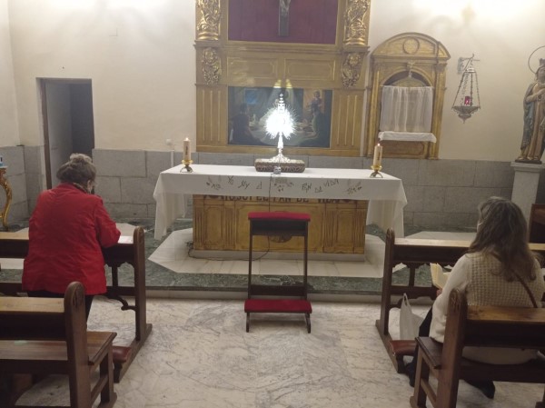 La Adoración continúa en la capilla del sagrario de la parroquia San Juan Bautista con todas las medidas de seguridad: mascarillas, distancia social y gel hidroalcohólico.