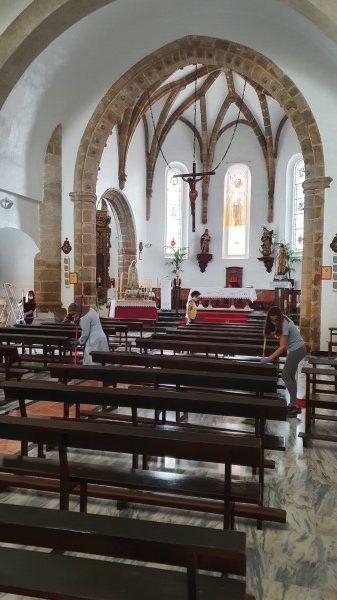 Limpieza del templo de Valverde de Leganés antes de su reapertura el miércoles.
