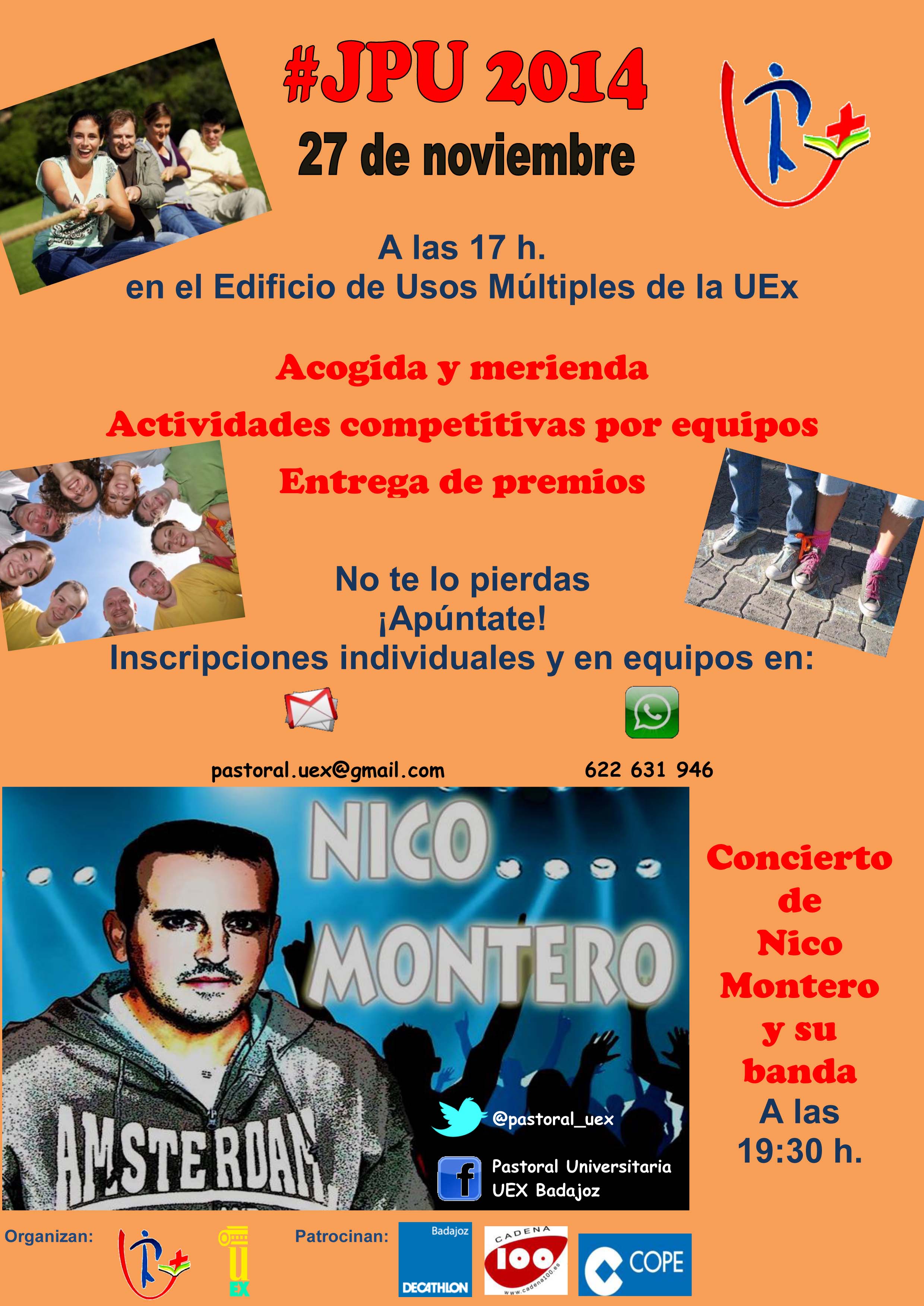 La próxima actividad que llevarán a cabo desde la Pastoral Universitaria en Badajoz será una Jornada que se celebrará el 27 de noviembre en el Edificio de Usos Múltiples del Campus de Badajoz. Comienza a las 17:00 h. con una acogida y merienda. A continuación, habrá actividades competitivas por equipos y entrega de premios. El colofón a esta Jornada lo pondrá el concierto de Nico Montero y su banda, a partir de las 19:30 horas.