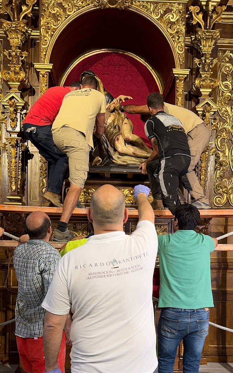 Según Agustín Velázquez, delegado episcopal para el Patrimonio, este retablo, realizado en madera tallada y dorada, cuenta con varias intervenciones, la más importante a mediados del siglo XVIII. Ahora ha sido cuidadosamente restaurado, para devolverle su esplendor original, por un equipo coordinado por el restaurador Ricardo Kantowitz del estudio Opificio de Restauro.
