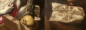 La repetición del Museo del Prado está cortada en la parte baja. La depositada en la catedral de Badajoz, de dimensiones más reducidas (76,5 x 57 cm), es la completa y lleva a la derecha un papel con la firma del pintor.